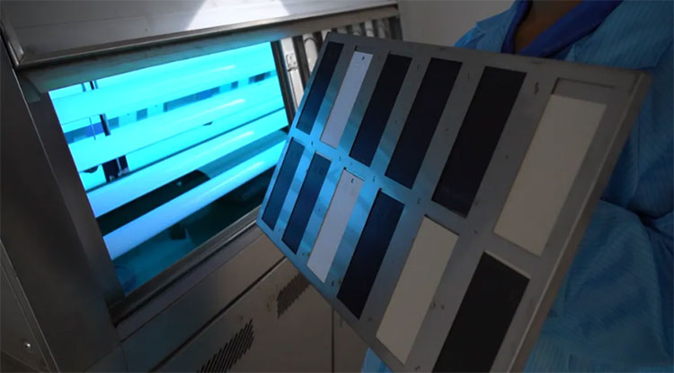 耐荧光紫外灯老化试验是进行荧光紫外老化试验,测试涂层试板老化过程中光泽度和色差变化,观察对涂层老化后的失光、变色、起泡、粉化、生锈和剥落等级进行评定。